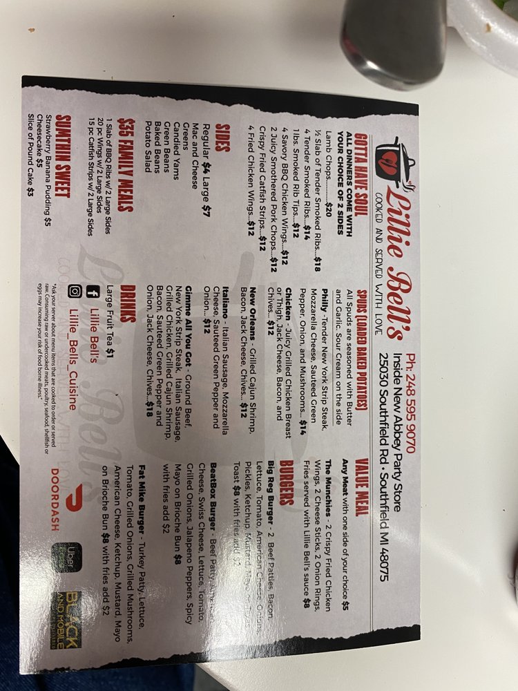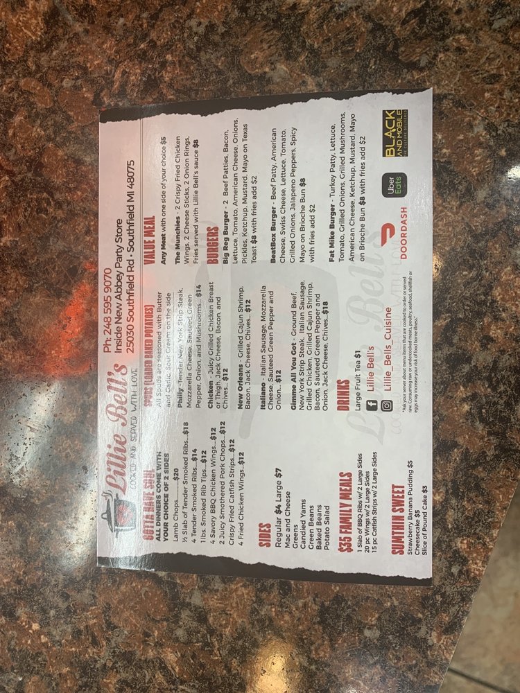 Lillie Bells offers a soulful and flavorful experience with their soul food and burger selections. Located in Southfield, MI, this hidden gem provides takeout options and ample parking for convenience. Indulge in their must-try signature dishes like the 4-piece Fried Catfish Strips, Loaded Baked Potatoes, and sumptuous Loaded Plates. Customers rave about the savory Mac and Cheese, perfectly cooked Fried Chicken Wings, and delectable Smothered Pork Chops. Despite being located within a gas station, Lillie Bells has been winning over customers with their generous portions and affordable prices. Reviews mention the friendly service and hot, ready-to-eat meals. The only room for improvement lies in the need for a standalone restaurant. Experience the heart and soul put into each dish at Lillie Bells - a true taste of comfort and satisfaction.